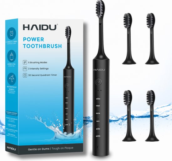 Deze elektrische tandenborstel van HAIDU valt op vanwege de uitstekende prijs-kwaliteitverhouding. Je ontvangt vier opzetborstels bij dit model en kiest uit zes standen en drie intensiteitsniveaus. De batterij gaat tot 90 dagen mee en de vormgeving is strak.