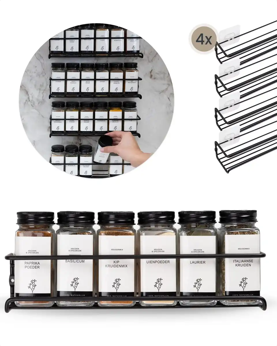 Je ontvangt vier rekjes van hoogwaardig metaal die je onder elkaar aan de muur hangt. De 24 bijbehorende potjes hebben een zwart deksel, passend bij het rek. We vonden de drie soorten strooideksels (72 in totaal) handig, omdat we zo altijd de juiste deksels voor de kruidensoort hadden.